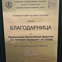 На 23 септември 2025 година, во Младинскиот културен центар (кино „Фросина“), на Православниот богословски факултет „Св. Климент Охридски“ во Скопје му беше доделена благодарница за долгогодишна успешна соработка со Институтот за социолошки и политичко-правни истражувања – Скопје. Благодарницата беше врачена на свечен настан организиран по повод јубилејот – 60 години од основањето на Институтот за социолошки и политичко-правни истражувања при Универзитетот „Св. Кирил и Методиј“ во Скопје.
