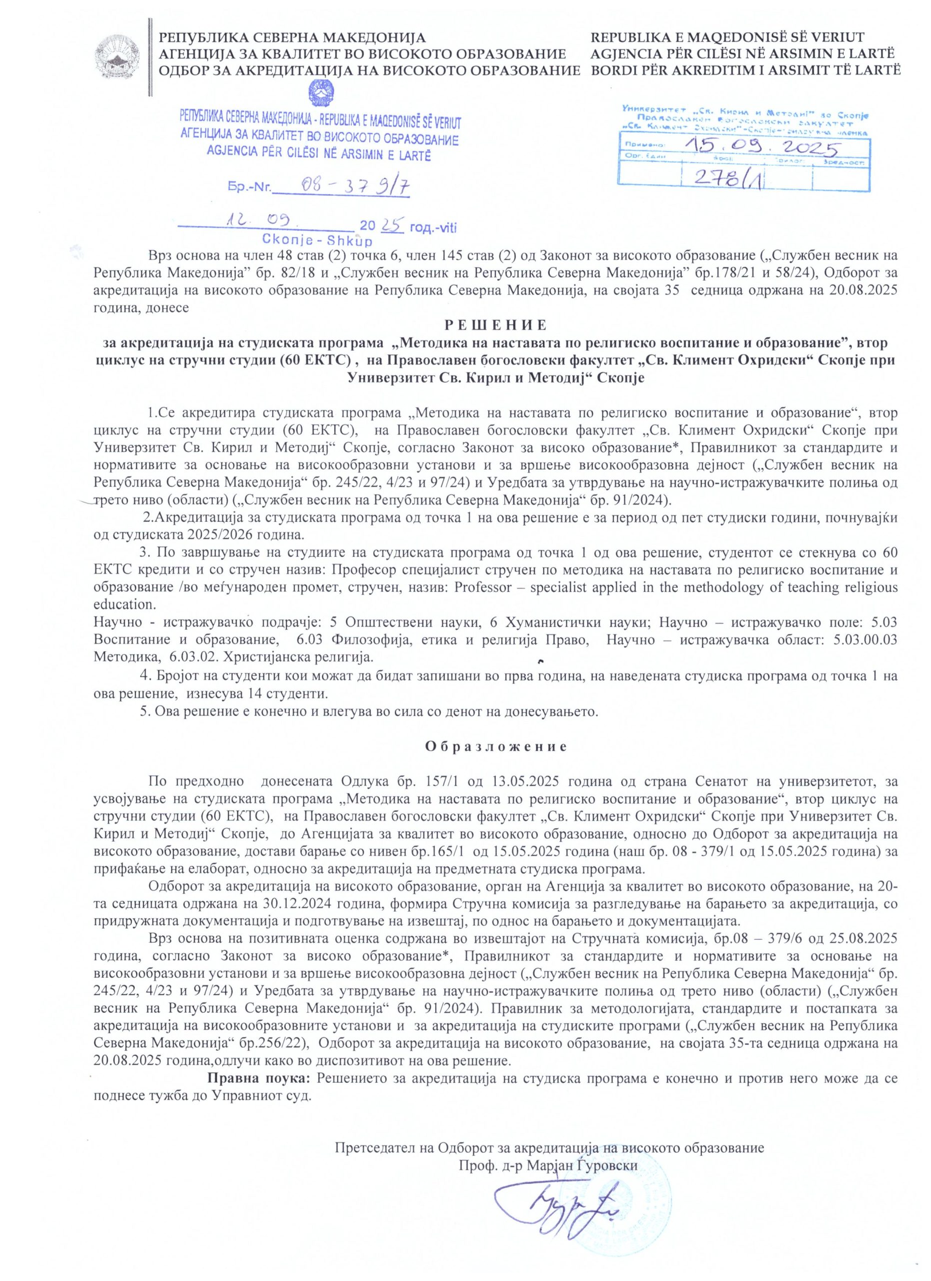 Програма за втор циклус стручни студии по методика на наставата по религиско воспитание и образование 2025